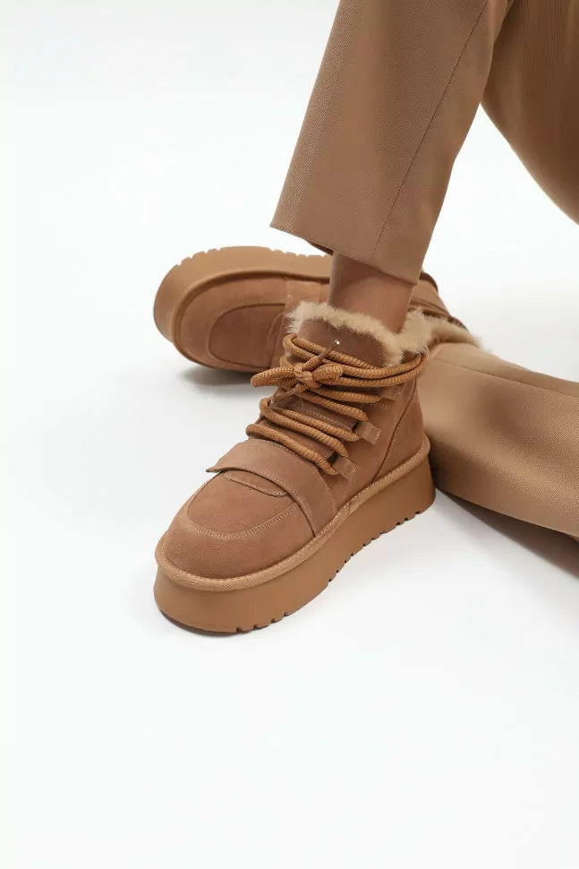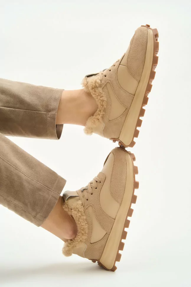 - Кросівки-уггі + дублянка в колір – натуральне поєднання, що виглядає одночасно вінтажно та сучасно. Обирай природні фактури та кольори, наприклад, у відтінках бежевого та шоколадного. Кросівки-уггі з щільної замші та із хутряним оздобленням стануть прекрасним компромісом між формальним та аутдор-взуттям.
